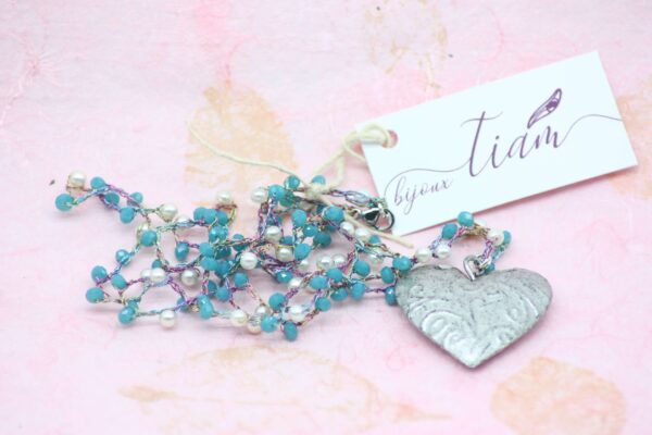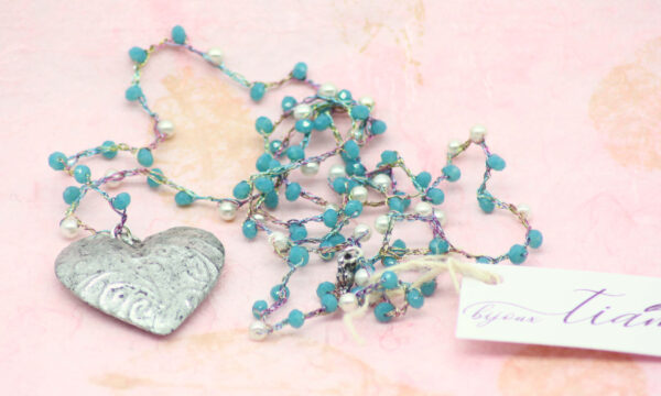 Collana lavorata a mano, con mezzi cristalli e ciondolo Cuore in metallo. Lunghezza collana: circa cm.86; lunghezza ciondolo: circa cm.4