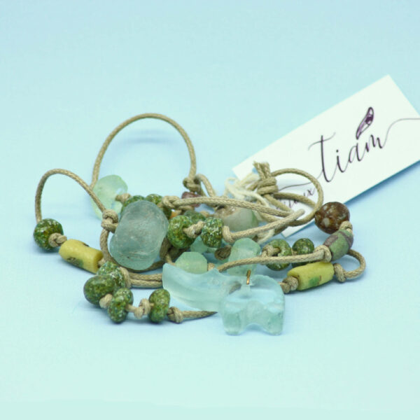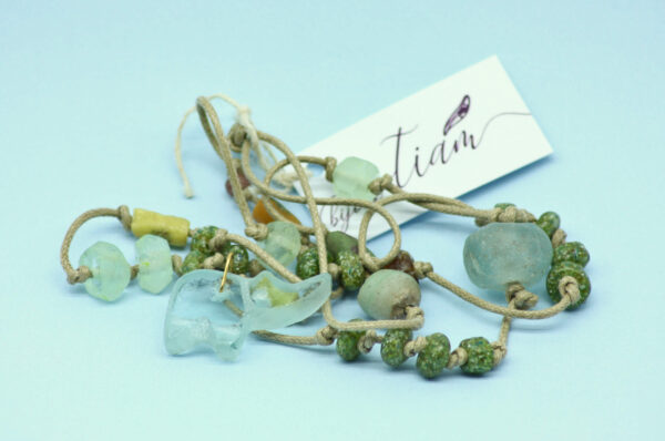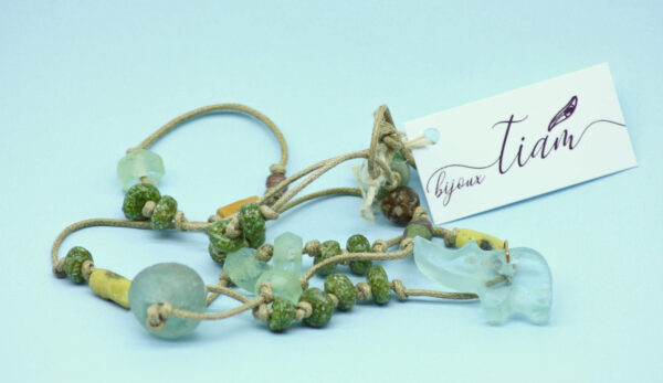 Collana con pietre indonesiane grezze e ciondolo Elefantino in vetro di bottiglia, lavorato a mano. Lunghezza collana: circa cm. 90; larghezza ciondolo: circa cm. 4.