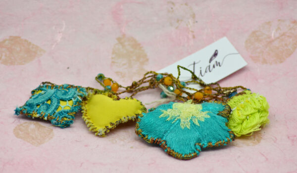 Collana lavorata a mano, con ciondoli ricamati a mano. Lunghezza collana: circa cm.106.