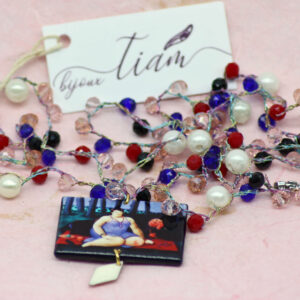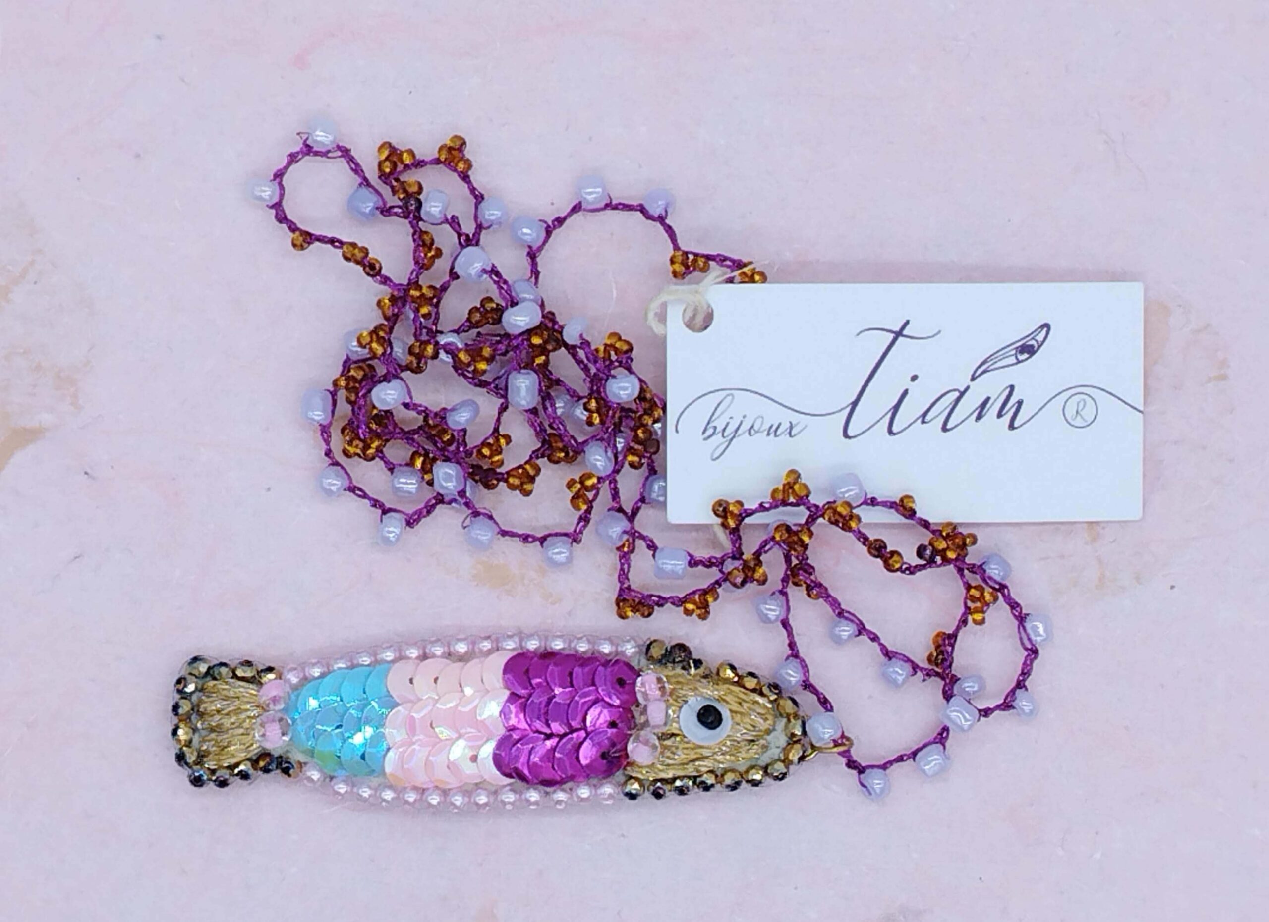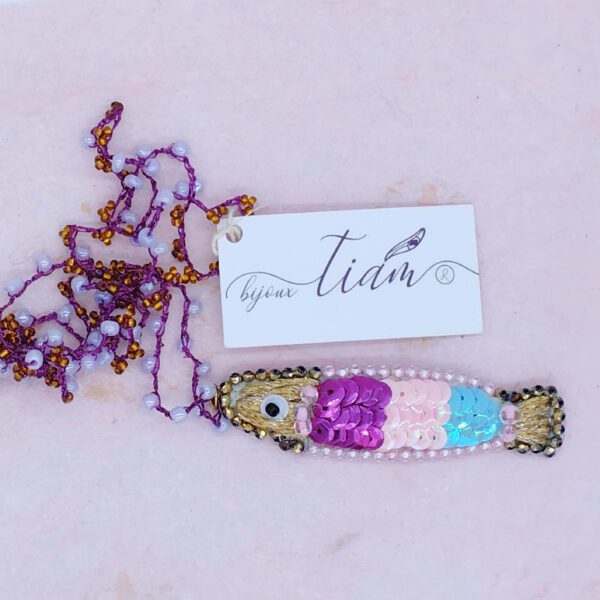 Collana lavorata a mano, con mezzi cristalli e ciondolo Sardina multicolore, ricamata interamente a mano. Lunghezza collana: circa cm. 90; dimensioni ciondolo: circa cm. 8